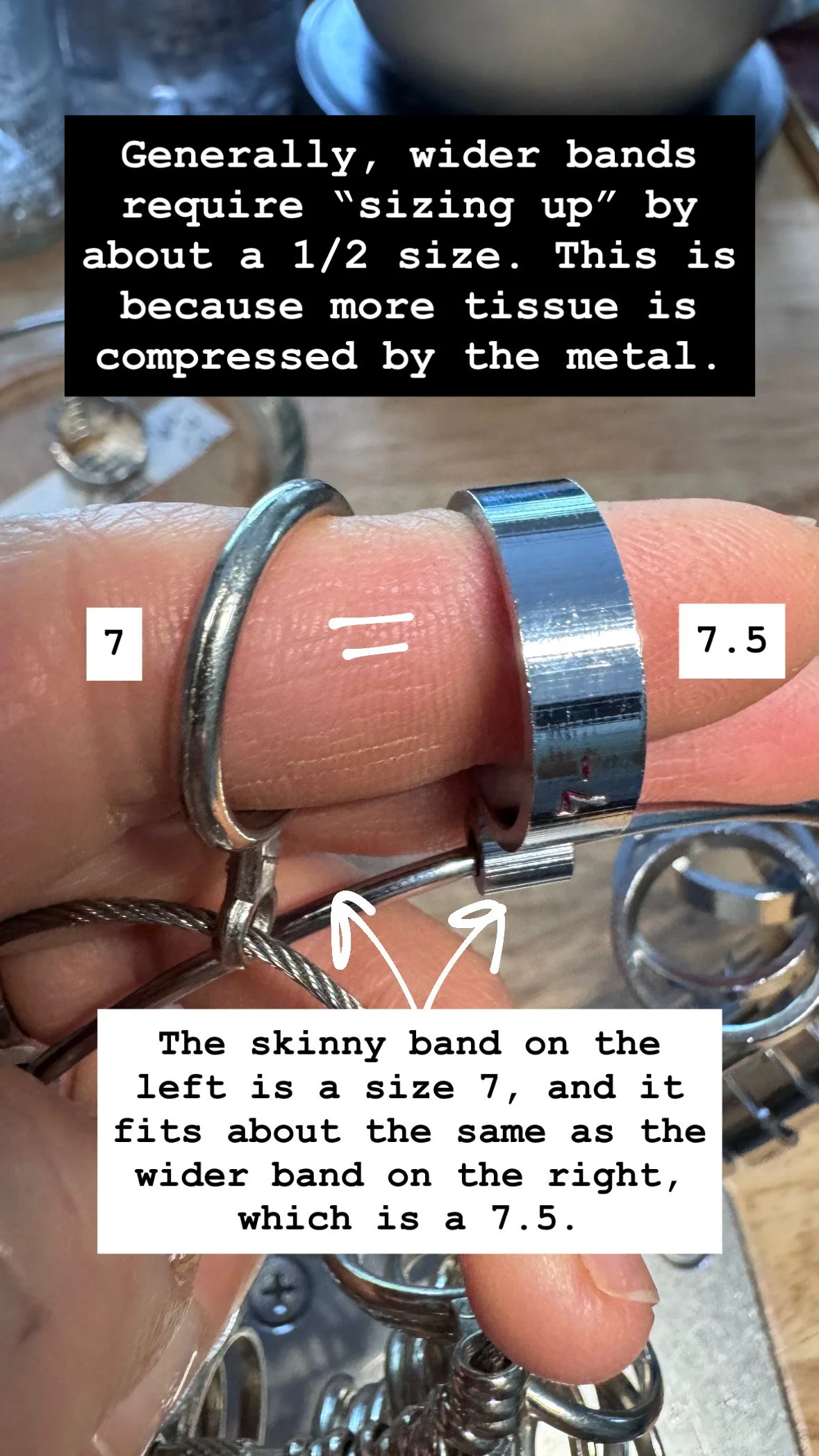 2 - Wider bands compress more tissue, requiring you to “size up” about 1/2 size (see image below).